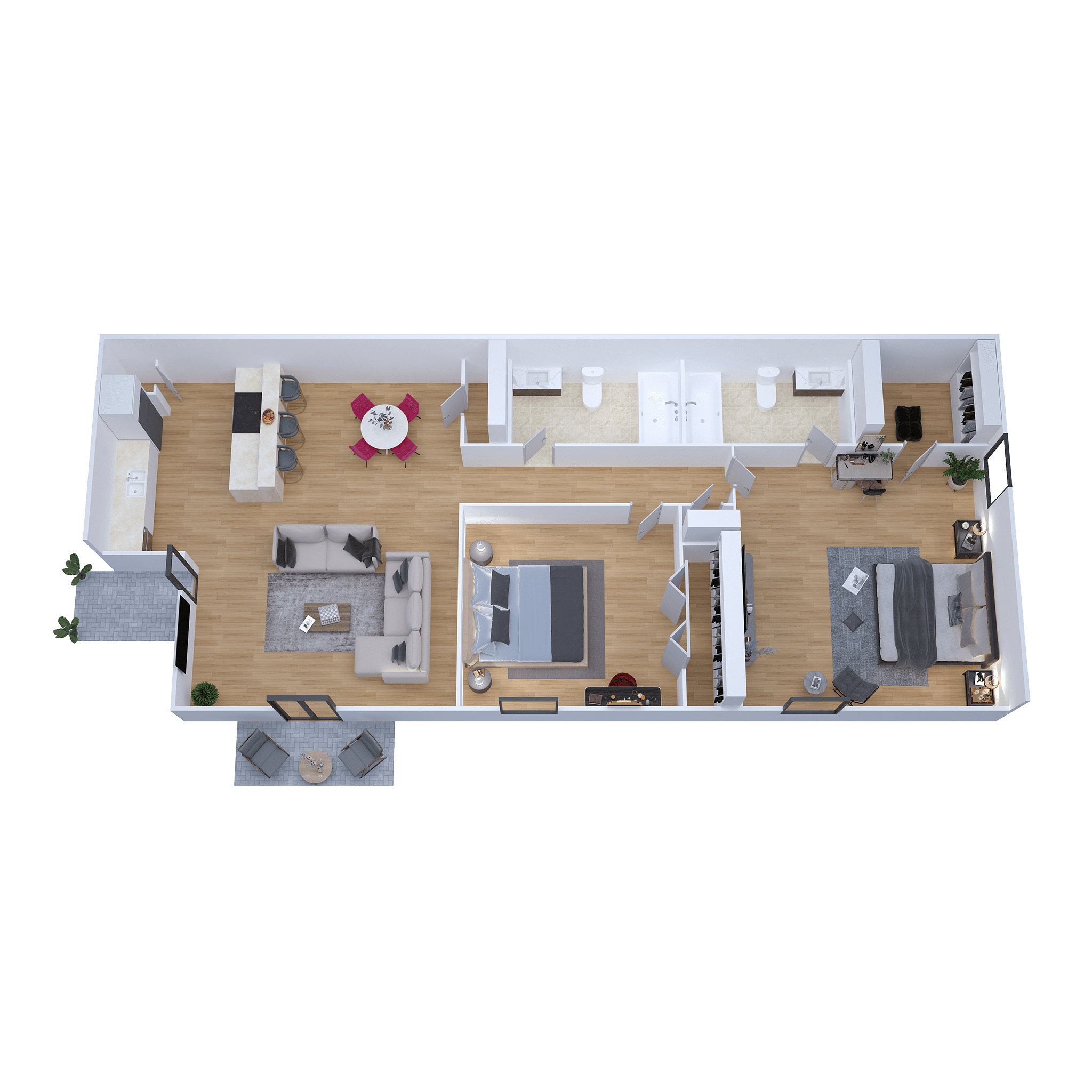 Explore our 1 and 2 bedroom apartments ranging from 615 to 964 sq ft. Every layout is designed for comfort, with wood-style flooring, stainless steel appliances, and private patios or balconies in select homes.